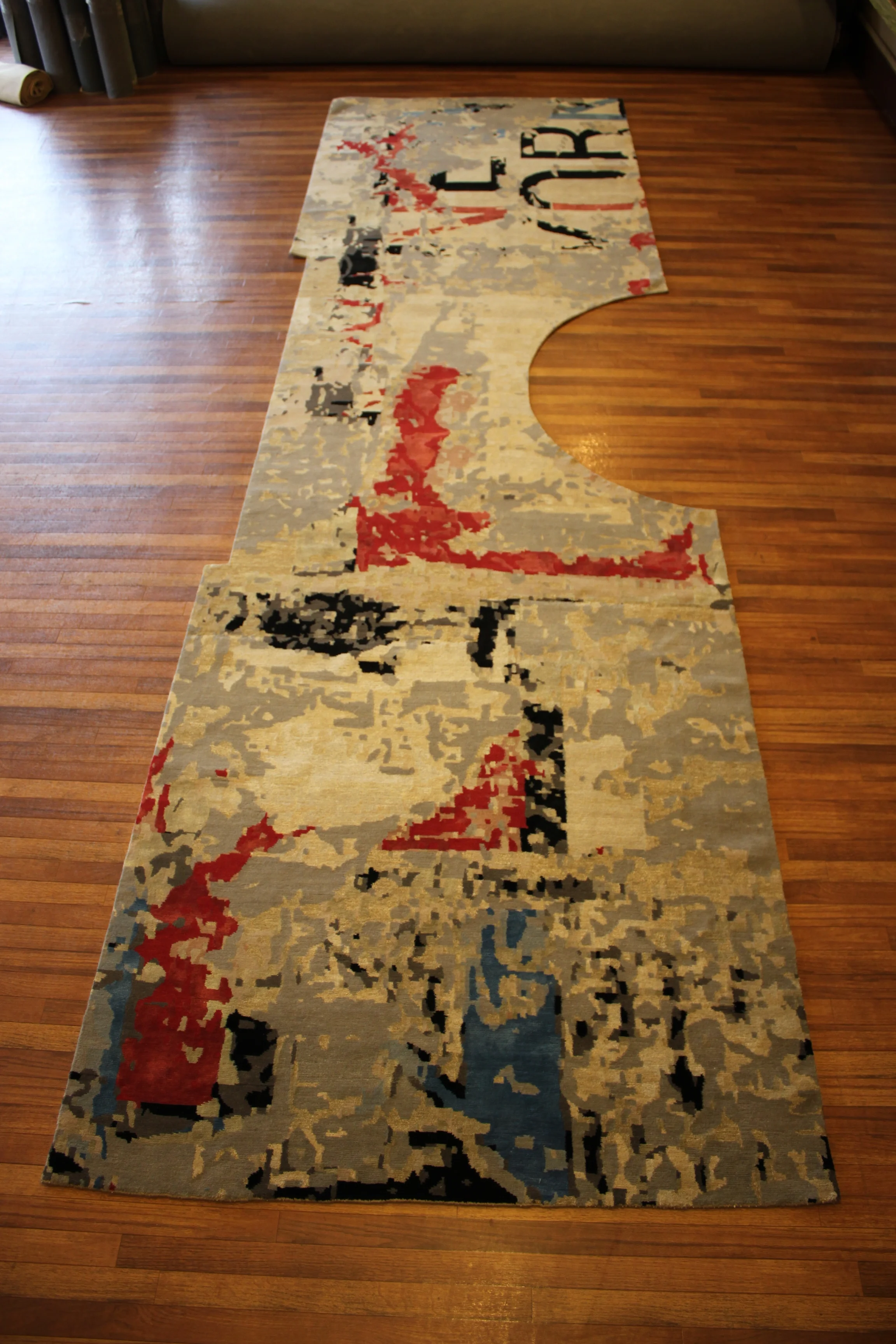 Circular and rectangular cuts made in Tibetan rug to fit around bathroom sink and cabinet.